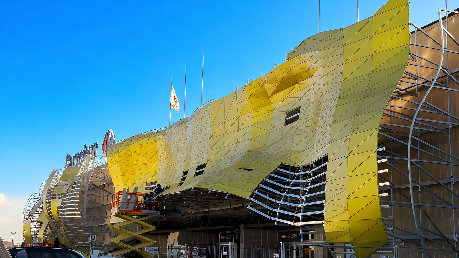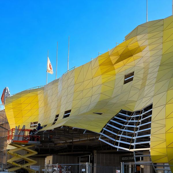 Il restyling dei prospetti esterni si è concretizzato nell’impiego di un rivestimento in pannelli di titanio il cui cromatismo caratterizza l’intero edificio. Grazie al supporto della retro-struttura in acciaio la superficie viene plasmata in modo organico, palpitante, come se rispecchiasse il turbinio dei flussi interni al centro commerciale.